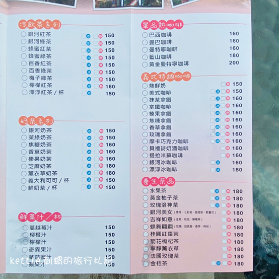 銀河鐵道假日菜單如下圖,供參考(平日菜單可參考官網)。餐廳規定每人需點一個品項或飲料,低消是150元。