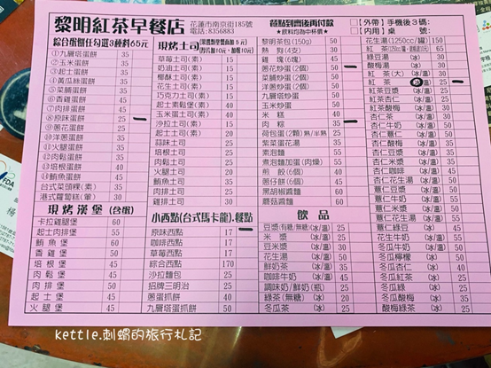 黎明紅茶菜單如下,供參考,清晰版可點閱官網。餐點就是提供早餐類常見的食物,譬如蛋餅、吐司等,價位落在15-60元。