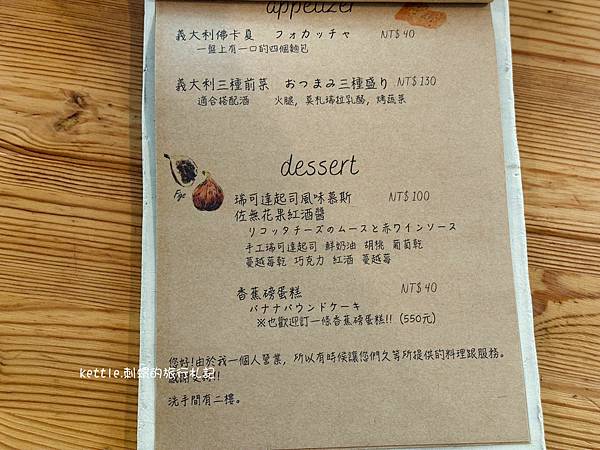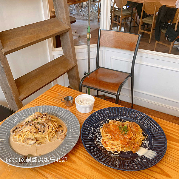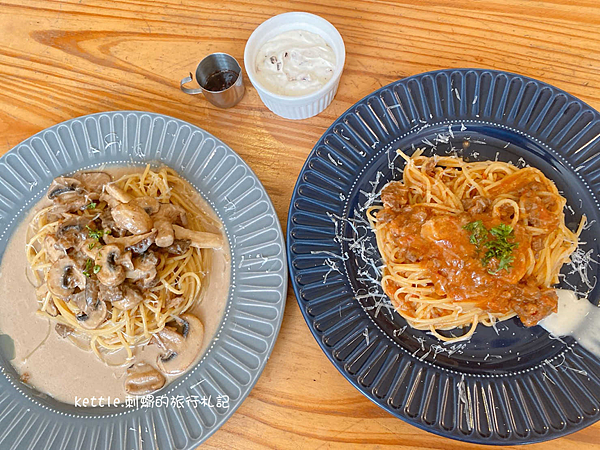我們下午還有安排下午茶,所以沒有點很多,男生來建議要花30元加麵,量會比較剛好,總共點了牛肝菌菇風味三種蘑菇奶油麵佐松露醬(330元)、特製肉醬麵佐白松露醬(290元)與瑞可達起司風味慕斯佐無花果紅酒醬(80元),兩人共花700元。