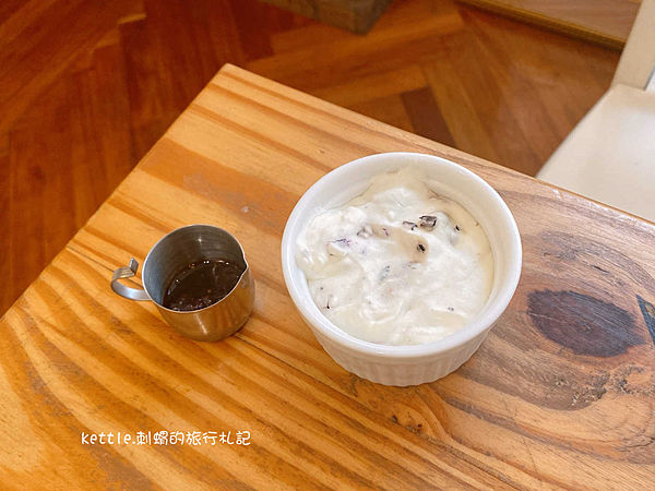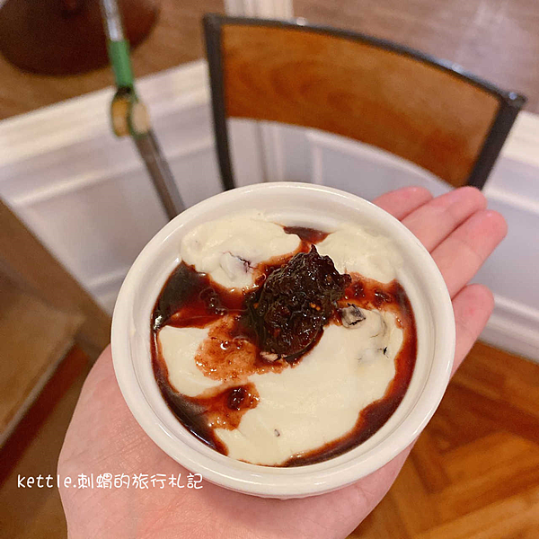 把旁邊的無花果紅酒醬淋上後,好看不少,瑞可達起司本身就帶有淡淡的甜味跟奶香,裏頭添加堅果與巧克力碎粒還有莓果,整份吃起來類似冰淇淋帶點餅乾的感覺,特別外口感也不錯。