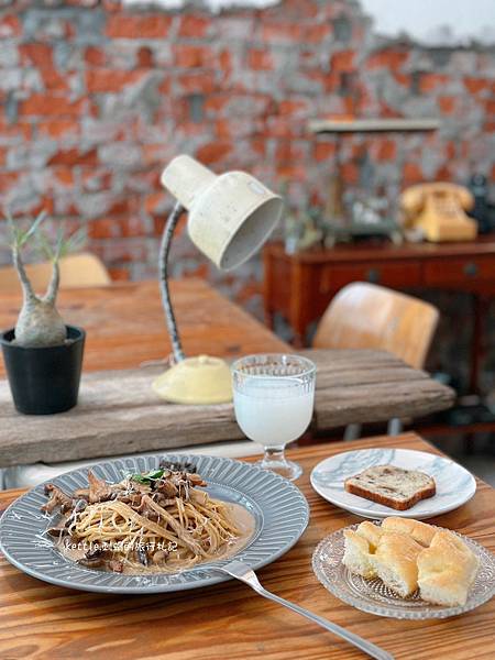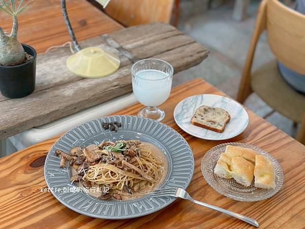 我點了一個牛肝菌菇風味三種蘑菇奶油麵佐松露醬(370元)、義大利佛卡夏(40元)、香蕉磅蛋糕(40元)與可爾必思(40元),共花490元。