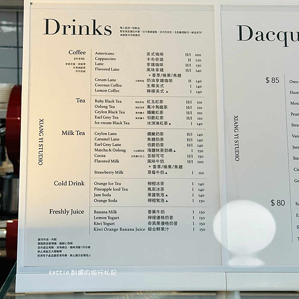 XIANG YI STUDIO享一點心工作室菜單如上,供參考,低消每人一杯飲品,可LINE PAY或收現金。