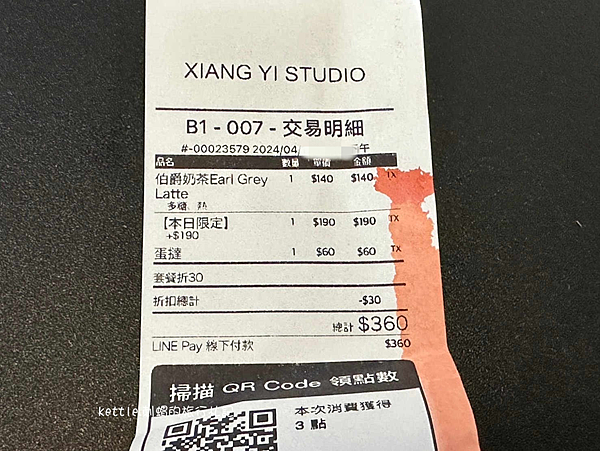 我點了一個伯爵奶茶(140元)、芒果白葡萄香緹蛋糕(190元)與蛋塔(60元),折抵30元,共花360元。